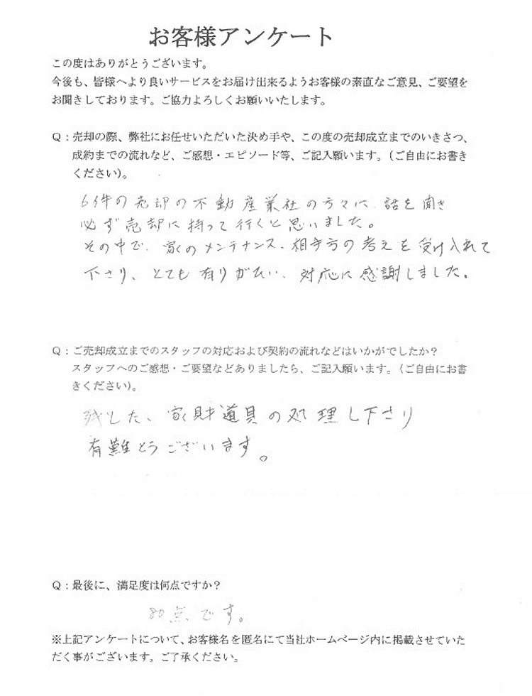 とてもスムーズに売却できましたので、100点です!