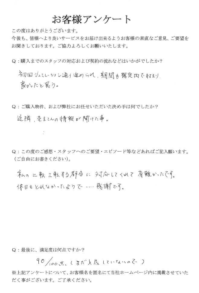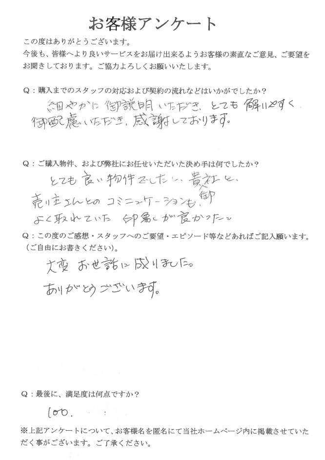 この度は弊社仲介にて、ご購入いただき誠にありがとうございました。O様は、不動産購入経験があるとの事で、事前に物件を調査された上でお問い合わせいただきました。 お取引きに関しても、精通していらっしゃったので、とてもスムーズにお取引きさせて頂きました。このように好評価をいただき光栄に存じます。今後も笑顔と誠実をモットーに精進して参ります!