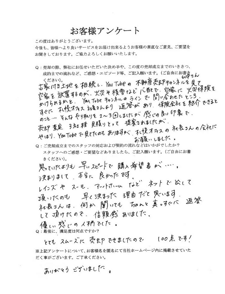古家付き土地を相続し、YouTubeの不動産売却チャンネルを見て空家を放置するのが火災や積雪など心配で、空家に火災保険をかけられるかとYouTubeチャンネルのラインで問い合わせたところ、すぐに札幌オフィス社長さんより返答があり、保険会社を紹介できるとのこと。